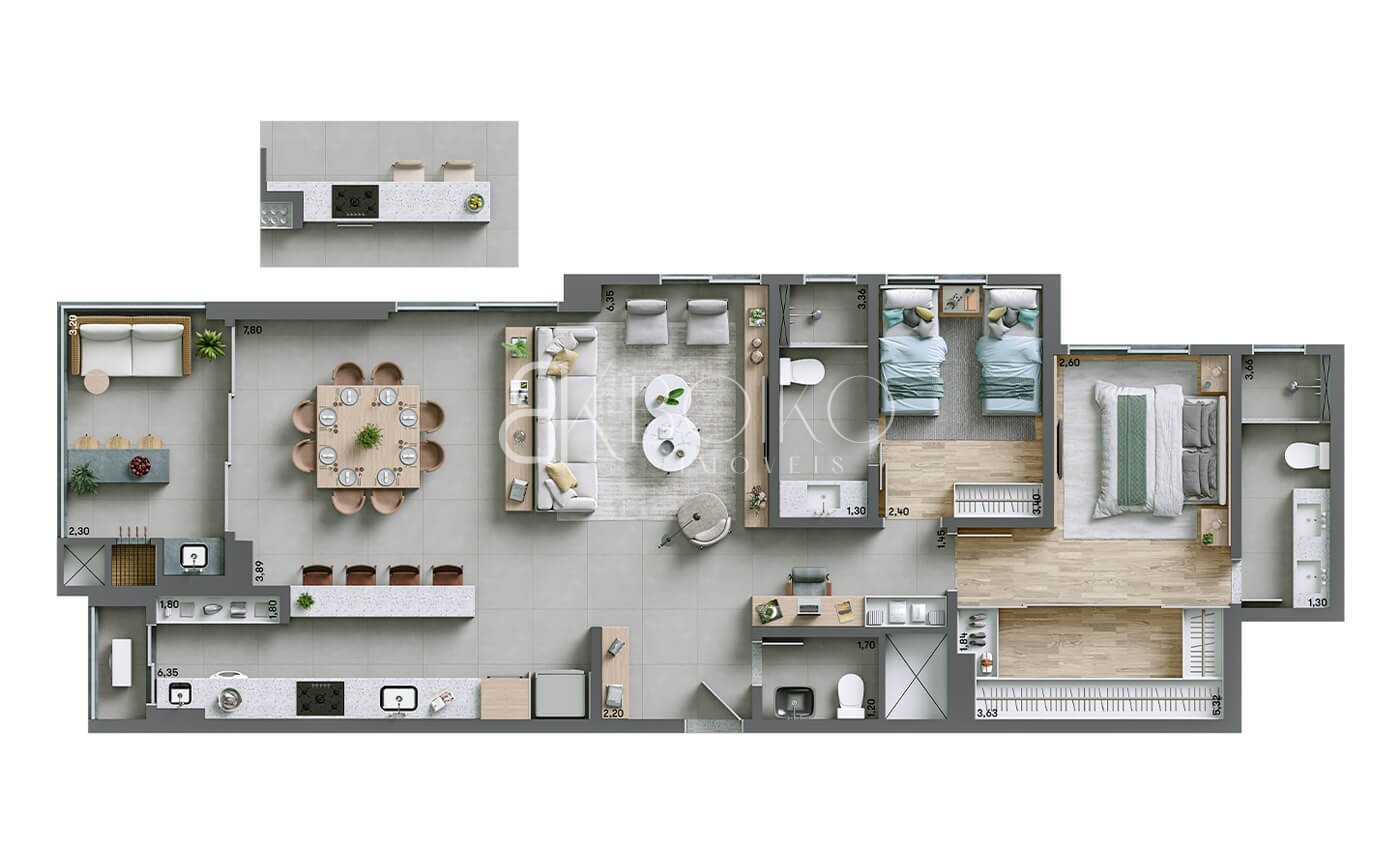 Com 112 m² de área privativa, este imóvel encanta pela planta inteligente e pelos ambientes amplos e integrados. A área social foi cuidadosamente pensada para proporcionar conforto e elegância, com uma sala espaçosa para dois ambientes conectada à cozinha — com possibilidade de ilha — criando o cenário ideal para receber com estilo. O espaço ainda conta com lavabo e um ambiente versátil para home office, atendendo perfeitamente às demandas da vida moderna.