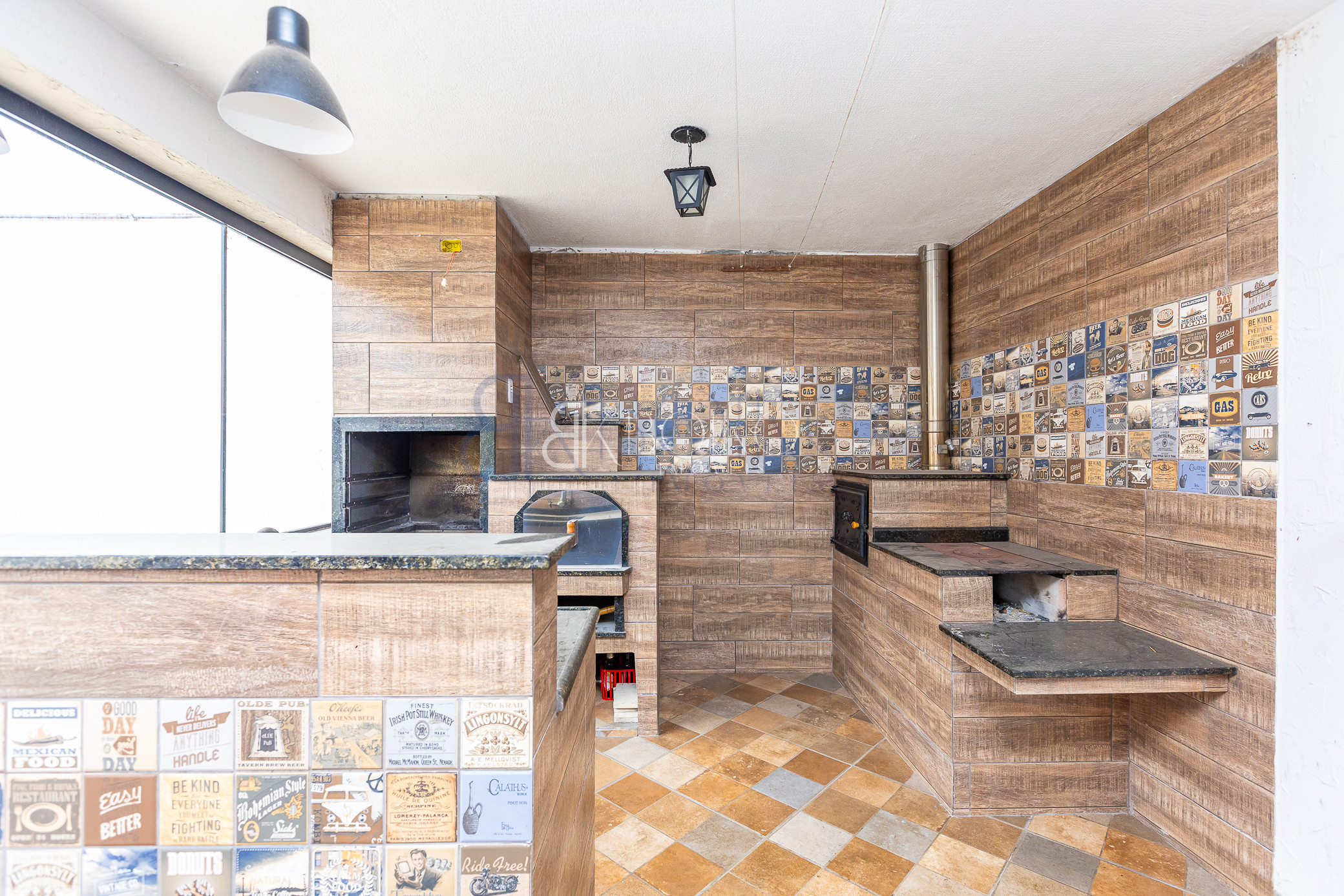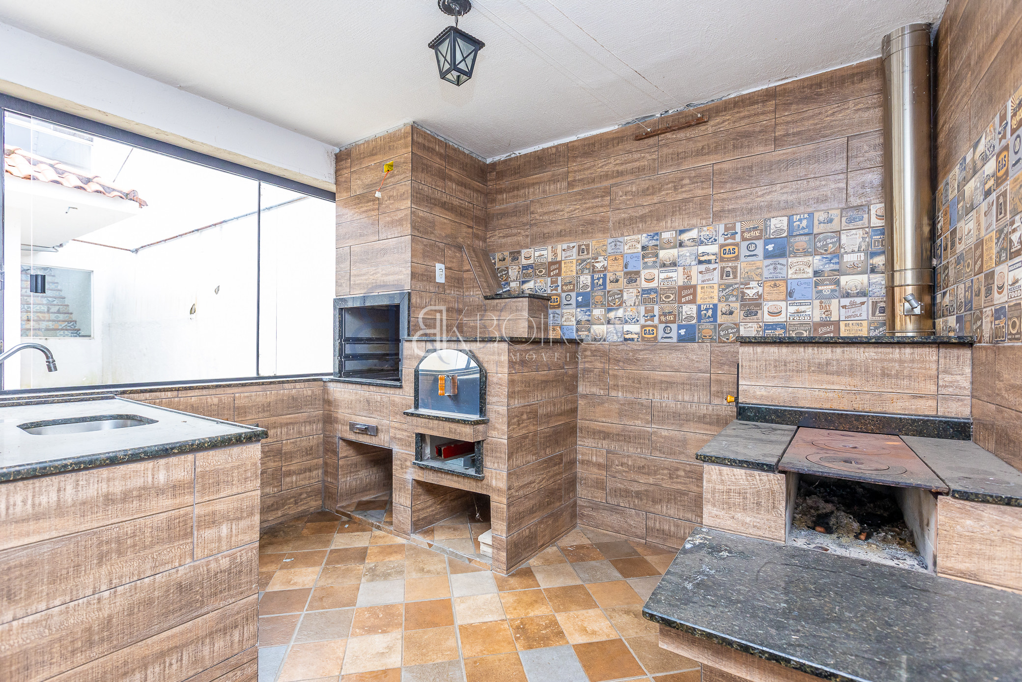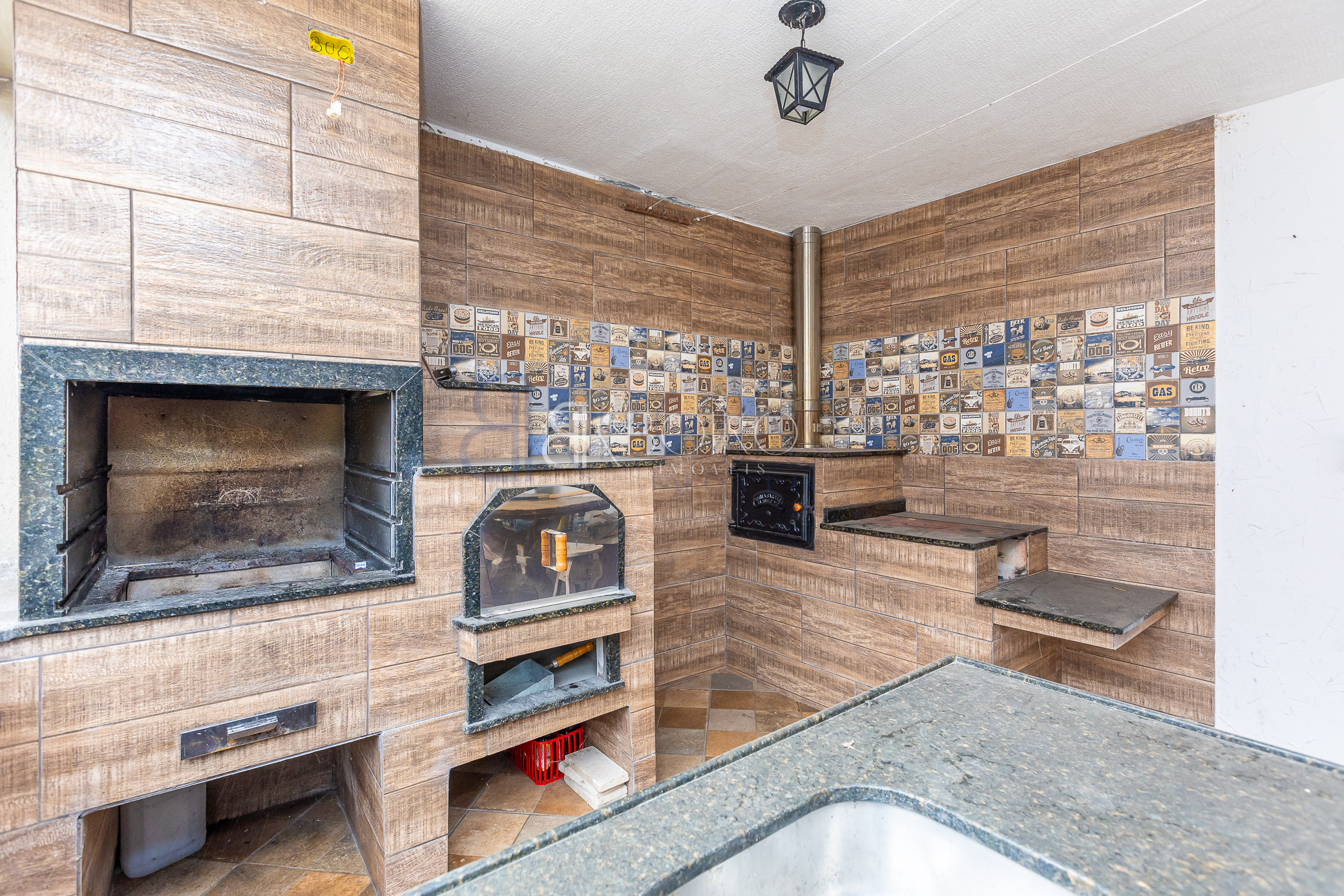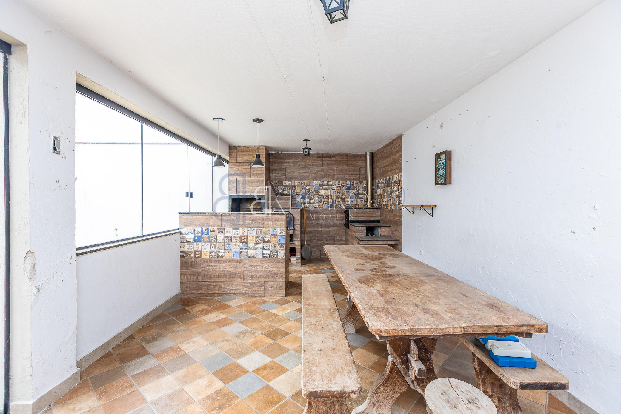 Edícula: com churrasqueira, fogão a lenha, forno a lenha, forno de pizza, e churrasqueira, balcão com pia e mesa grande para 10 lugares, banheiro.