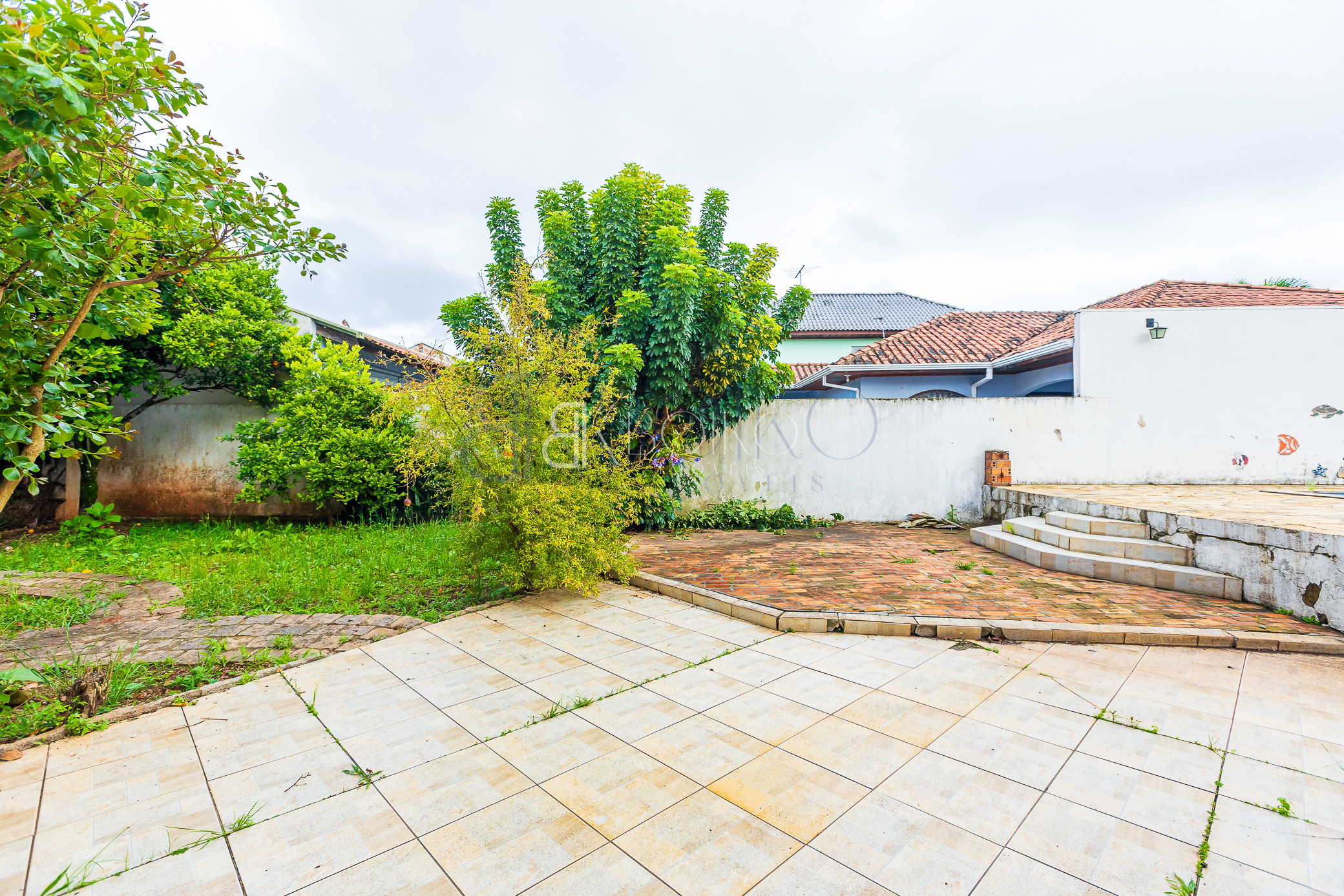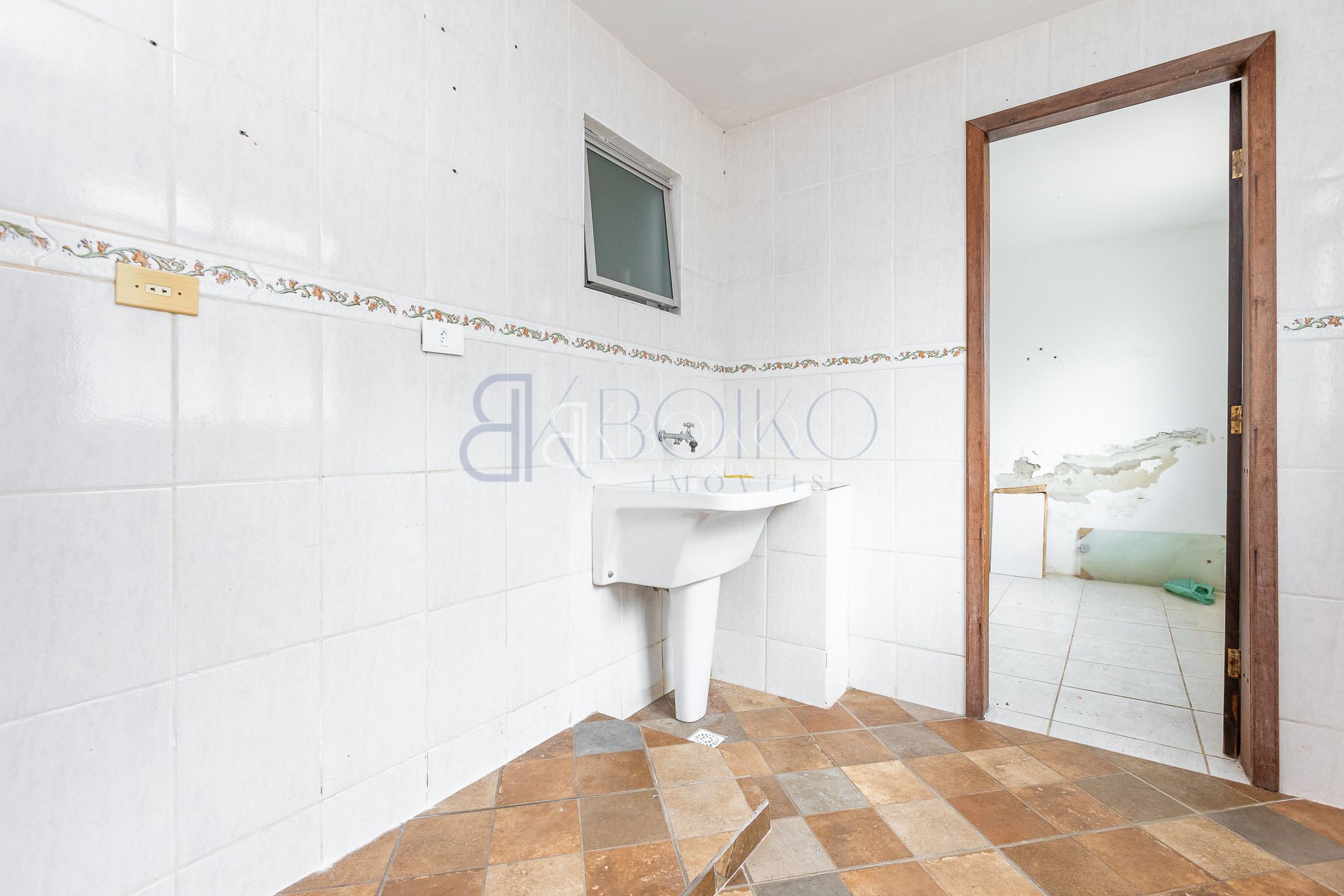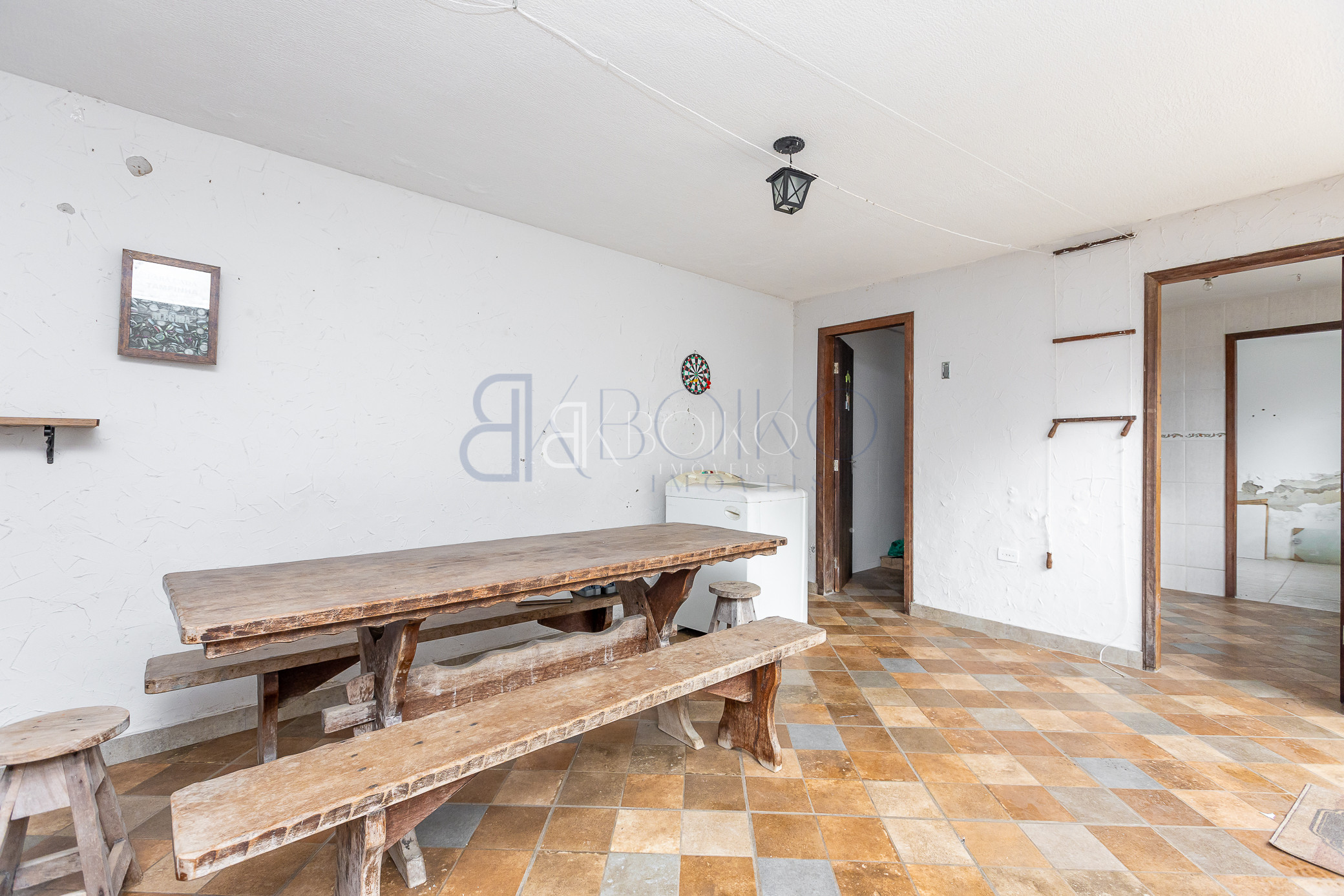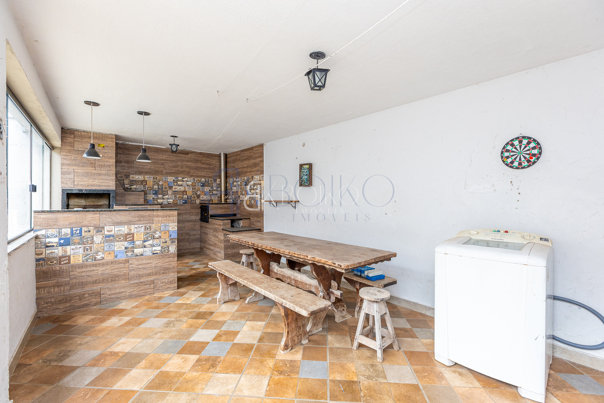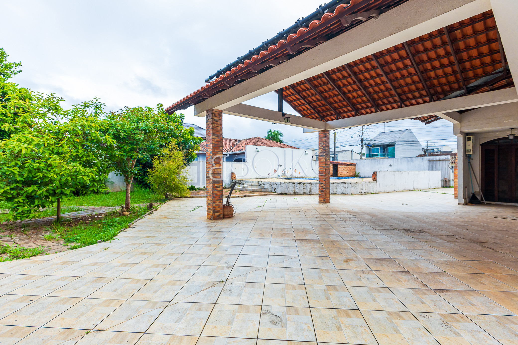 Lavanderia, quarto de empregada, canil, quarto de ferramentas, garagem para 02 carros cobertos e para 08 carros descobertos.