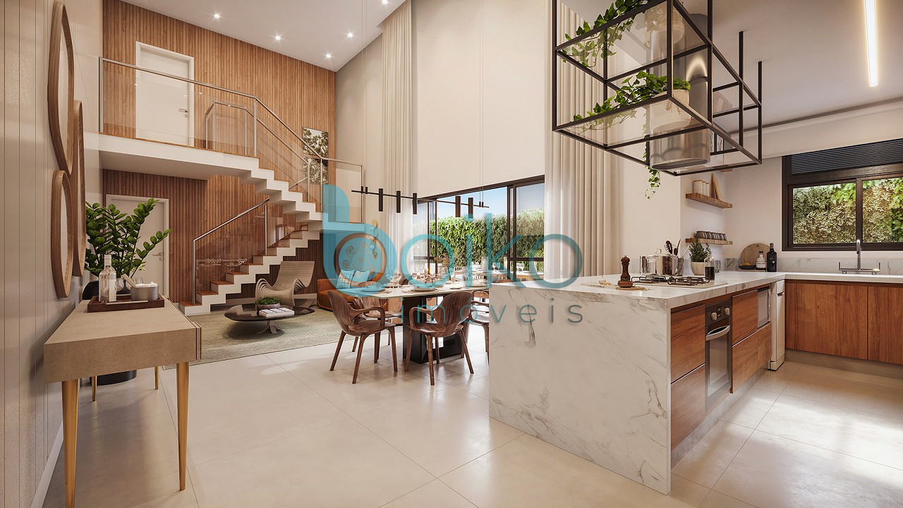 O piso inferior possui salas de jantar e estar integradas com a cozinha em conceito aberto, tudo com muita iluminação natural e amplos acessos à sacada com churrasqueira e ao terraço, compondo um amplo e versátil ambiente social com quase 100 m², que é completado por um charmoso lavabo e um ambiente multifuncional que pode ser usado como adega, depósito ou mesmo um pequeno escritório isolado. Ampla e discreta área de serviços separada, bem iluminada e ventilada, contendo uma laje técnica fechada, asseguram a infraestrutura com isolamento acústico.