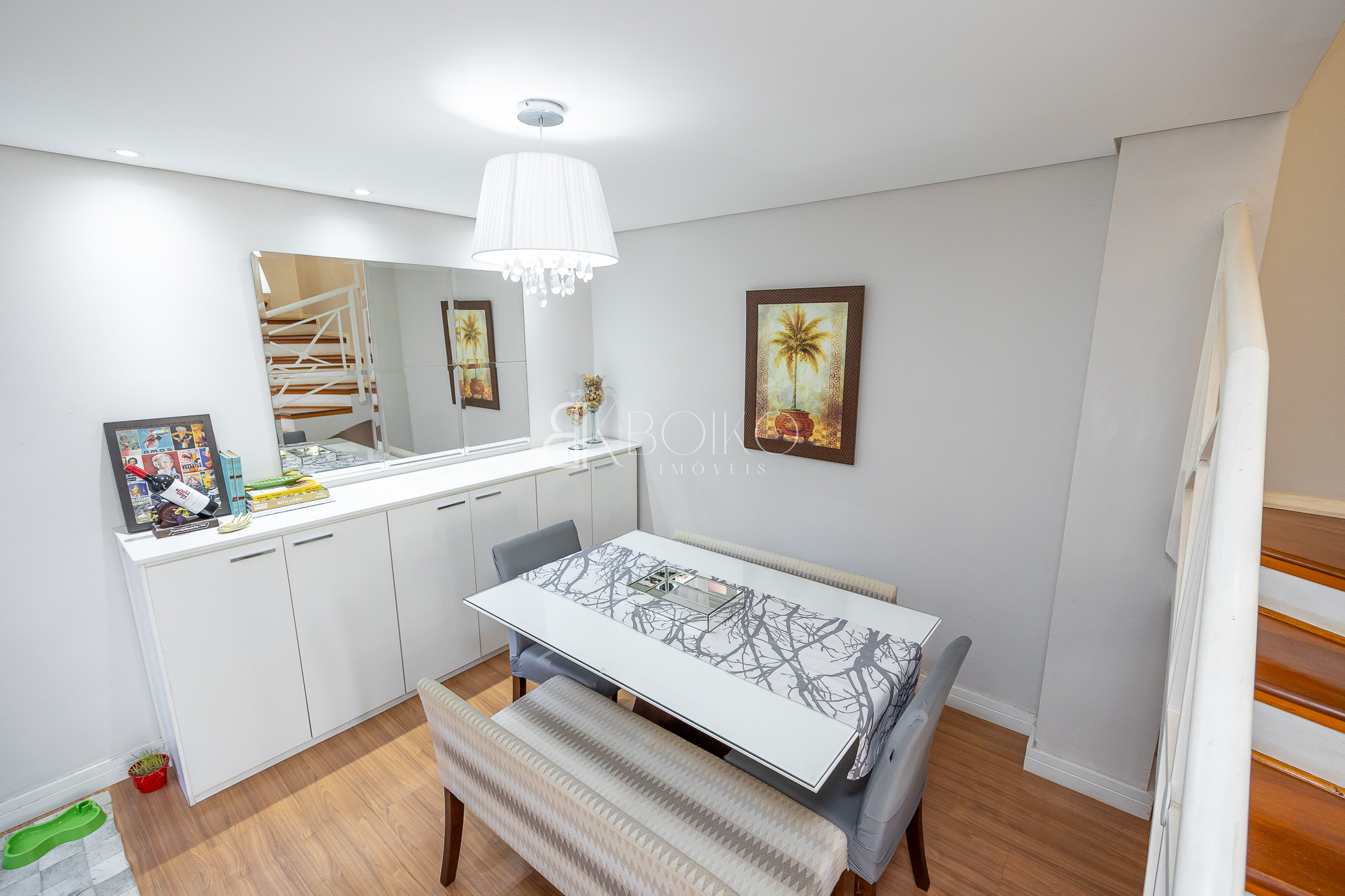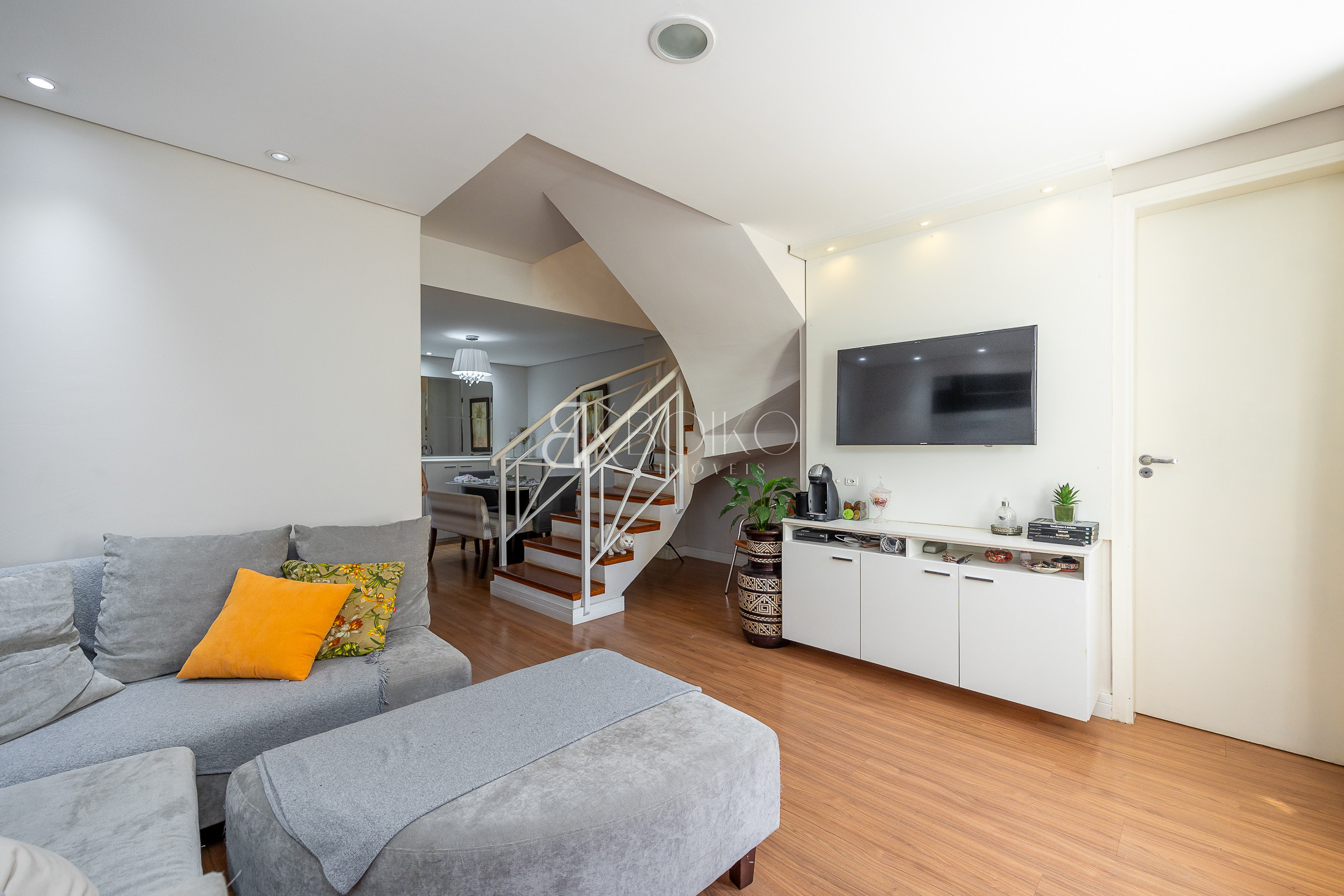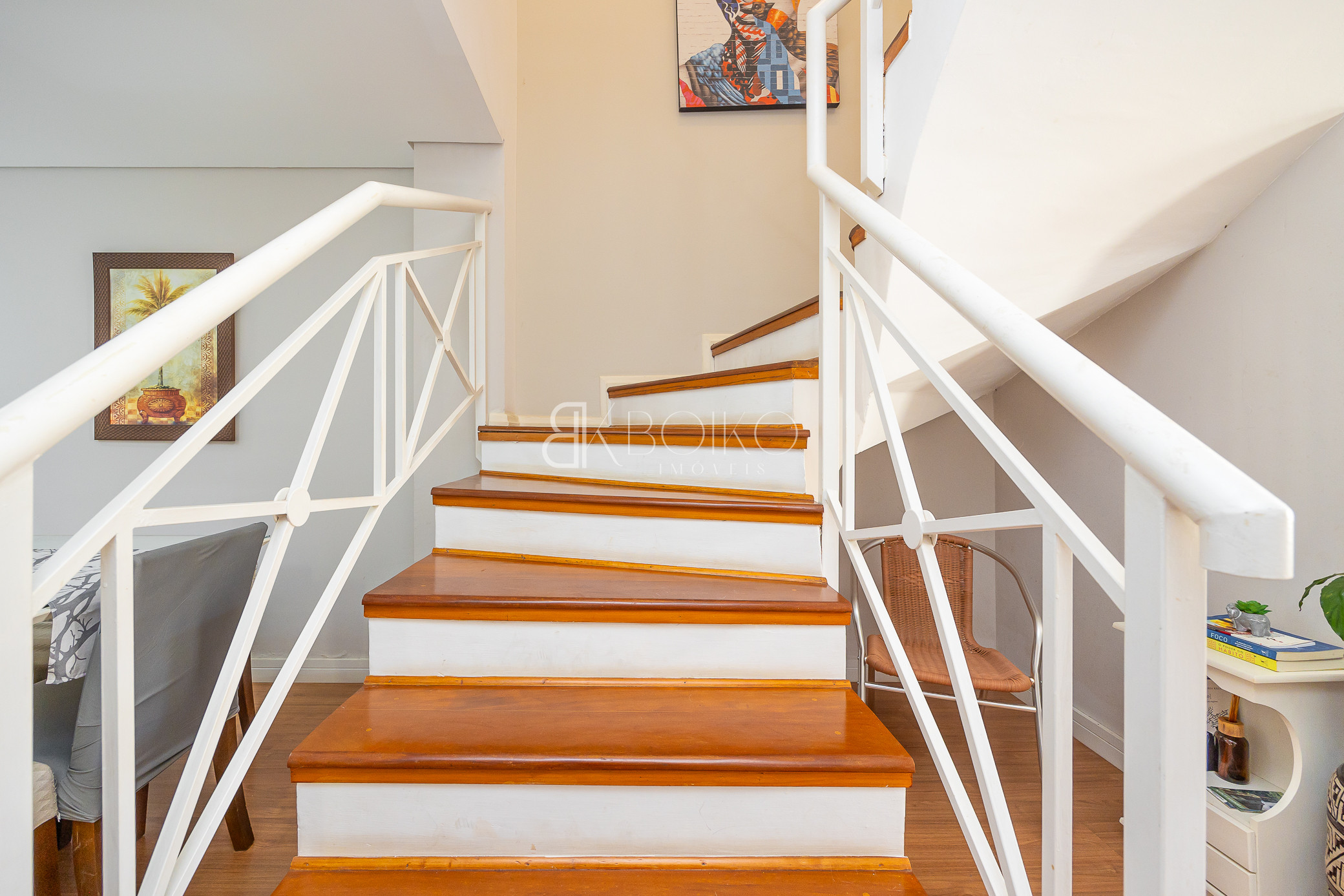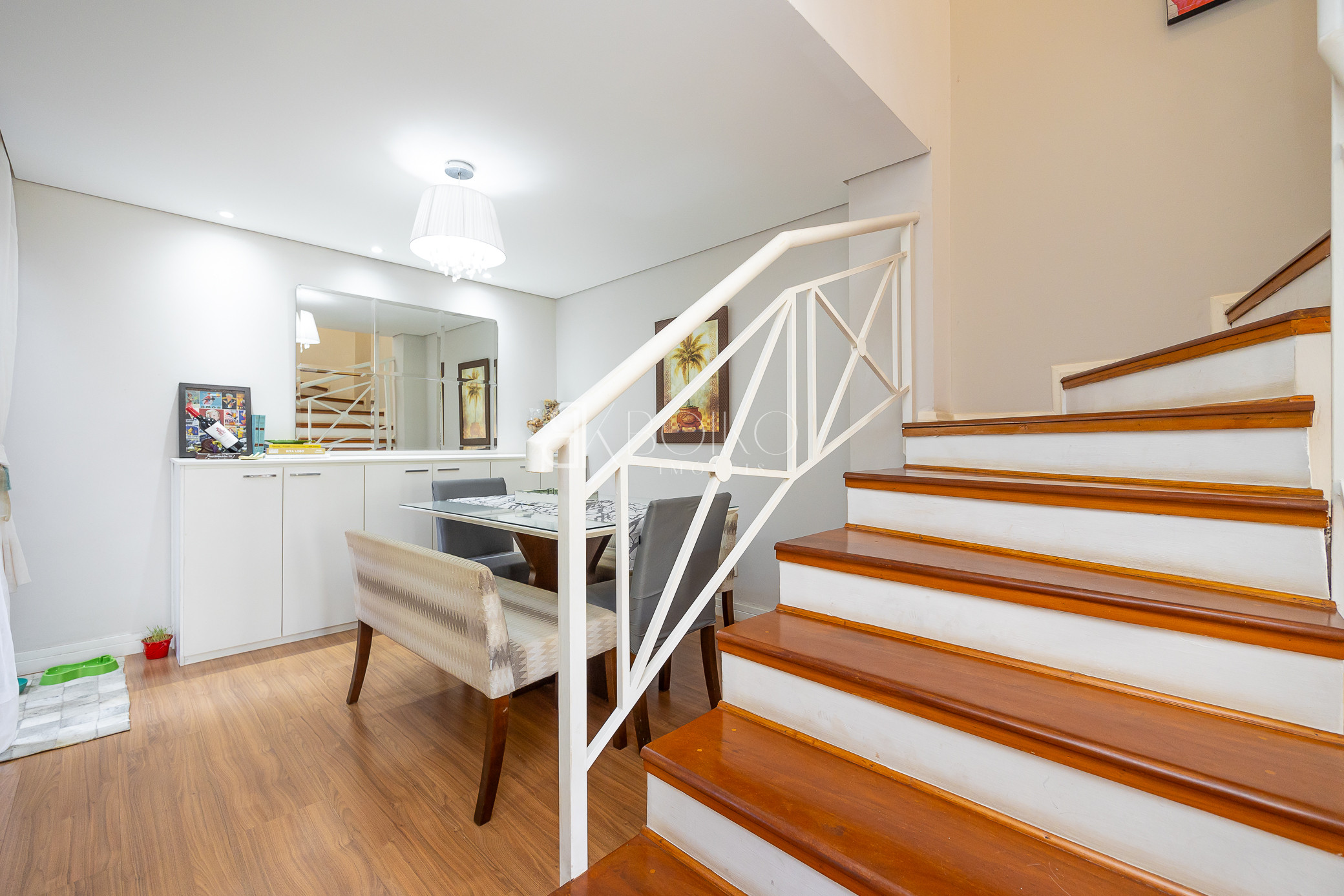 Térreo: Sala para dois ambientes, com ótima ventilação e luminosidade, teto rebaixado em gesso com iluminação, piso laminado, móveis planejados. Cozinha com armários sob medida, lavanderia com armários, espaço para jardim, escada em madeira.