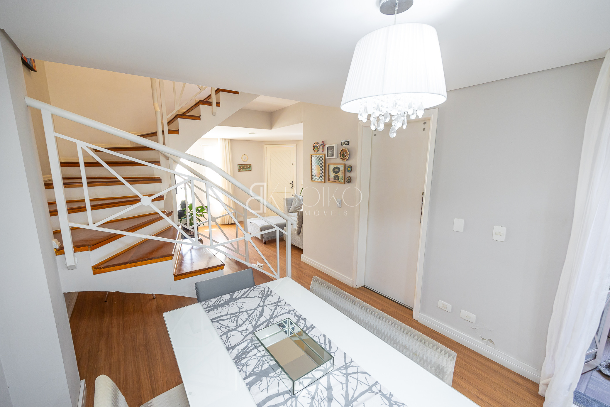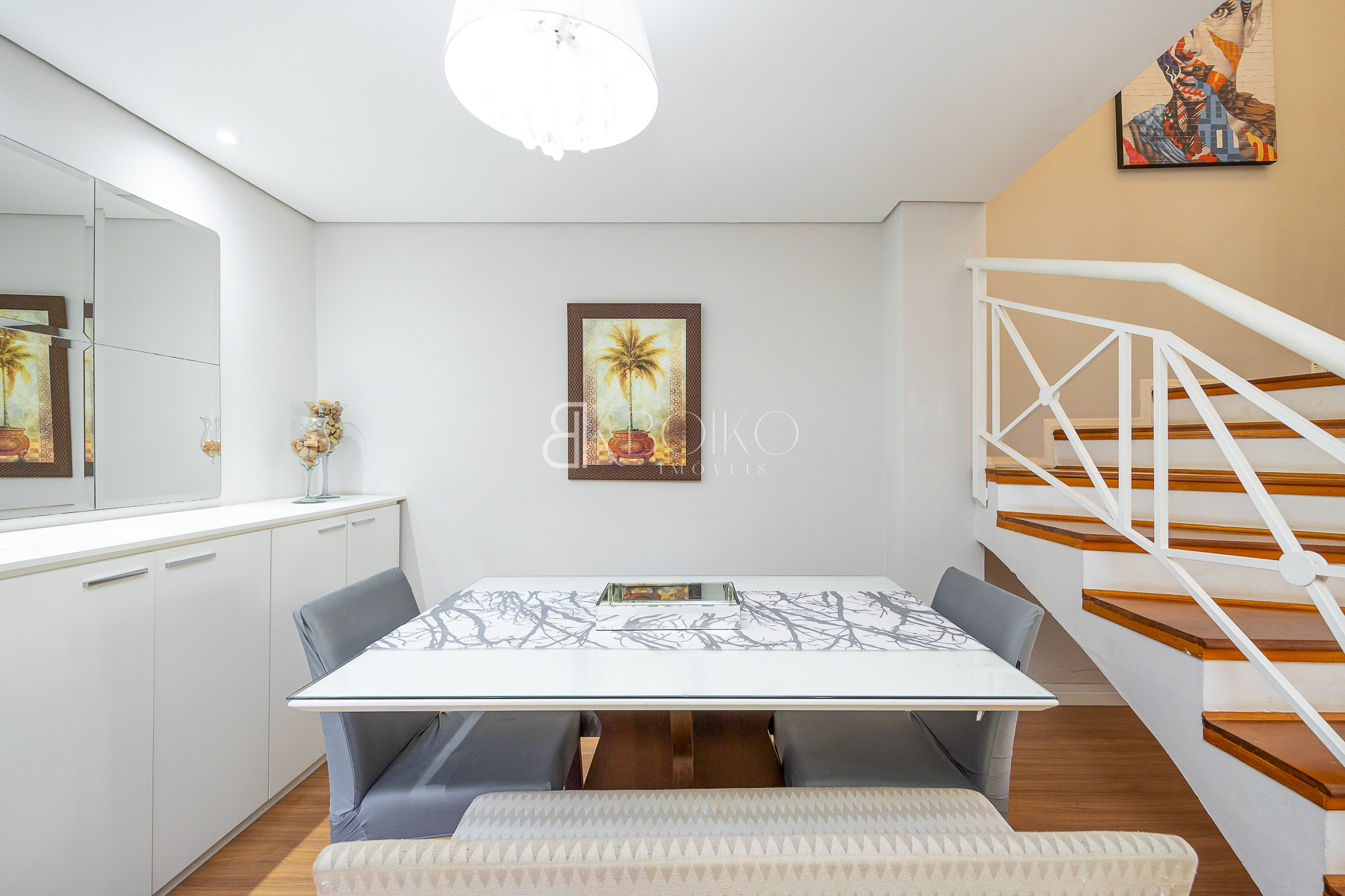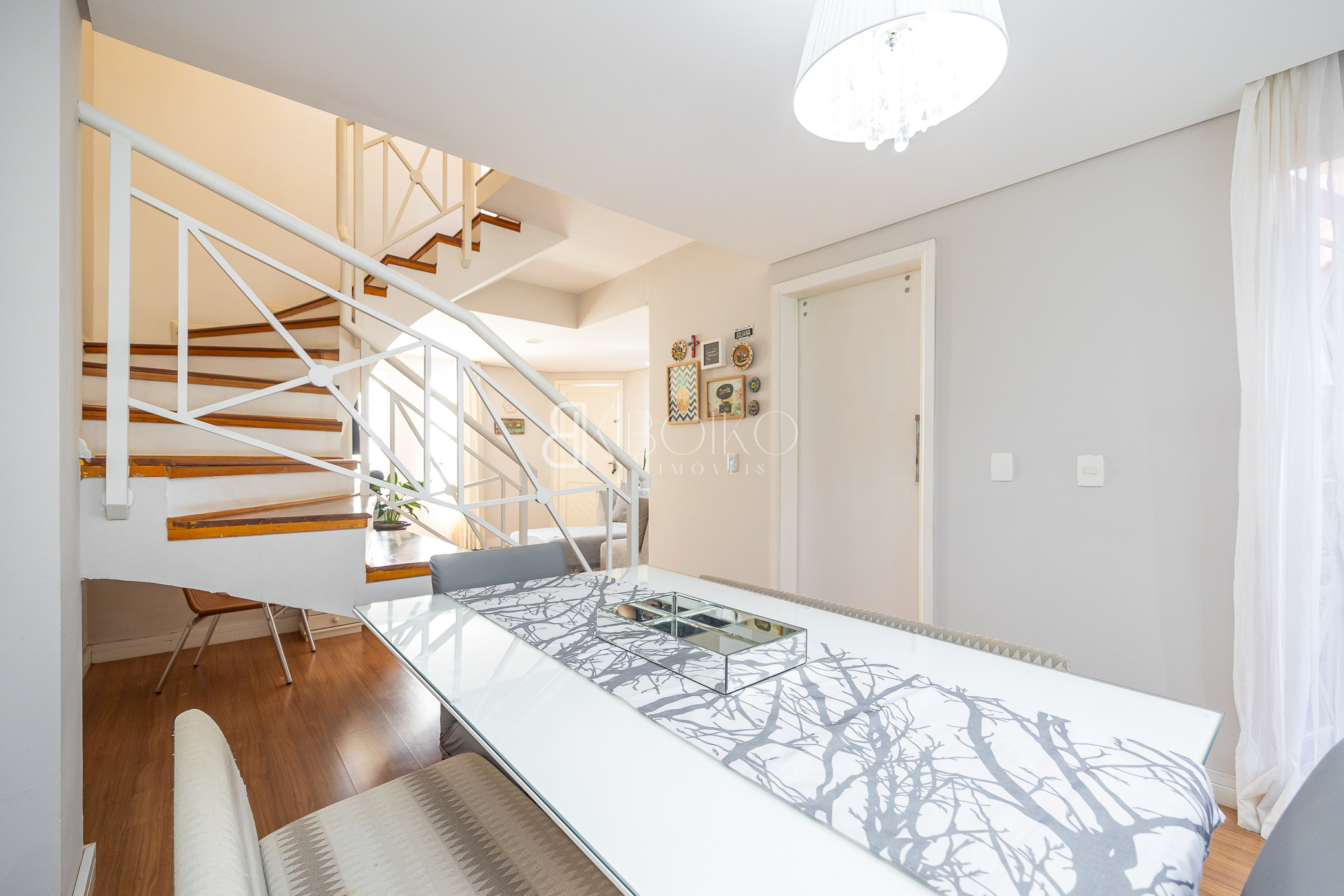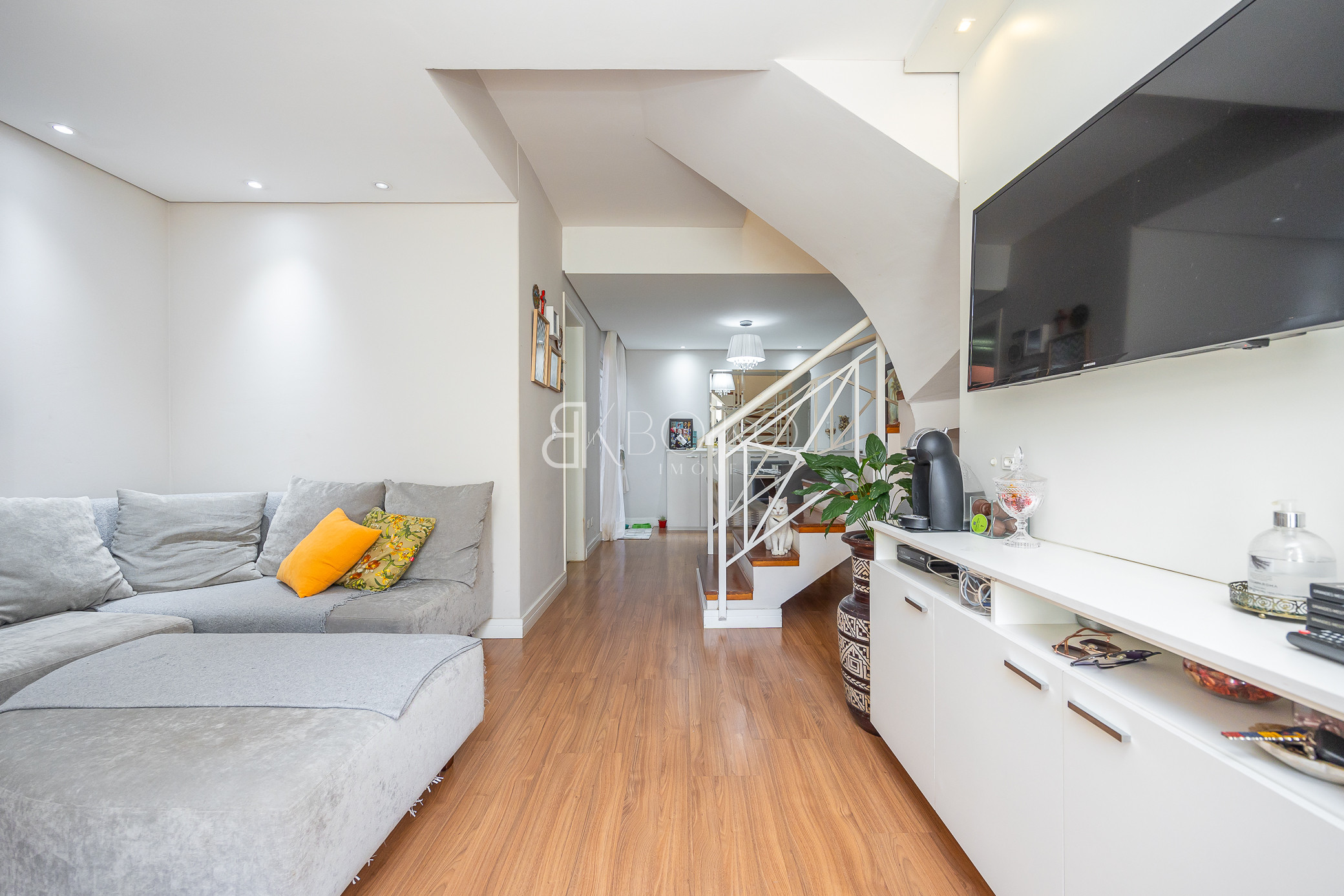 Térreo: Sala para dois ambientes, com ótima ventilação e luminosidade, teto rebaixado em gesso com iluminação, piso laminado, móveis planejados. Cozinha com armários sob medida, lavanderia com armários, espaço para jardim, escada em madeira.