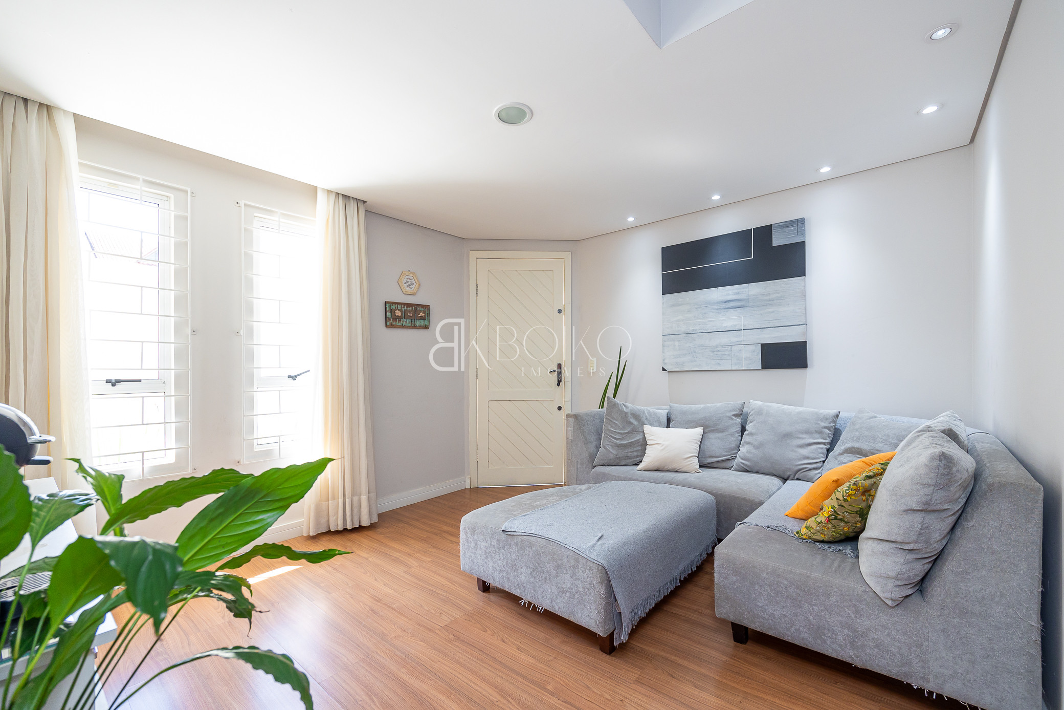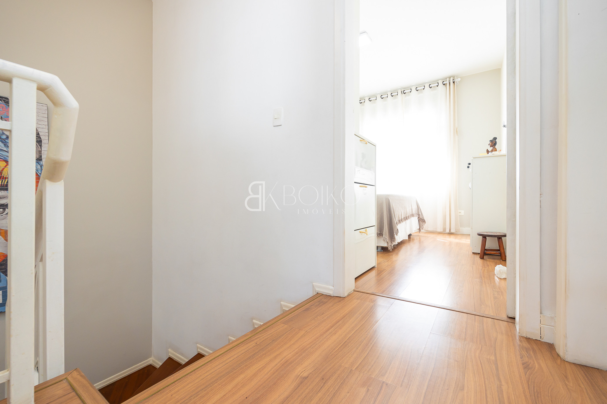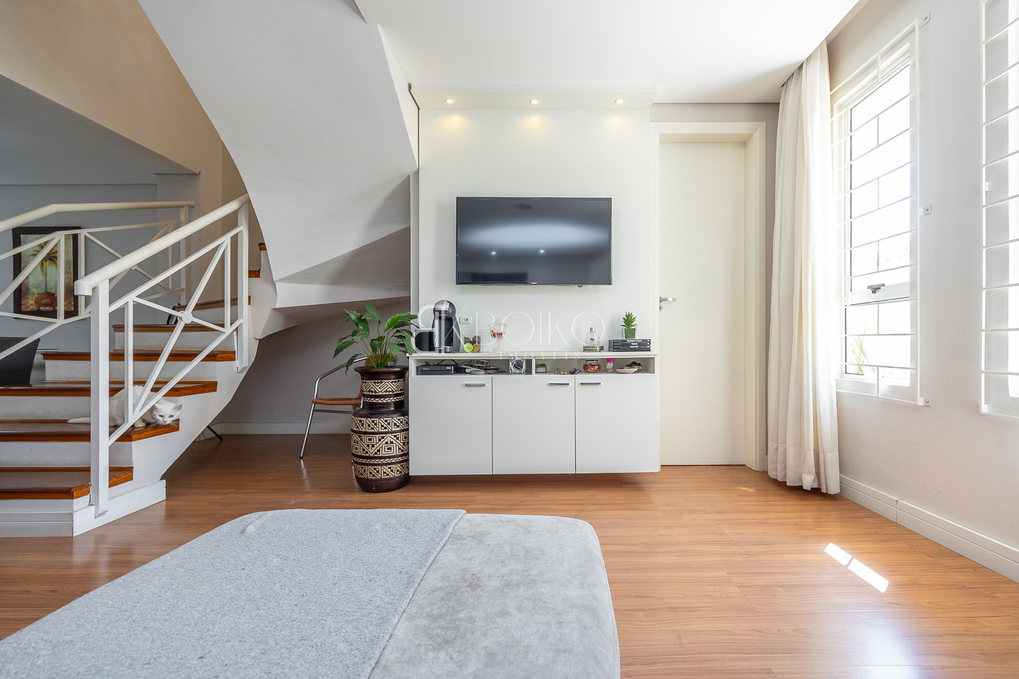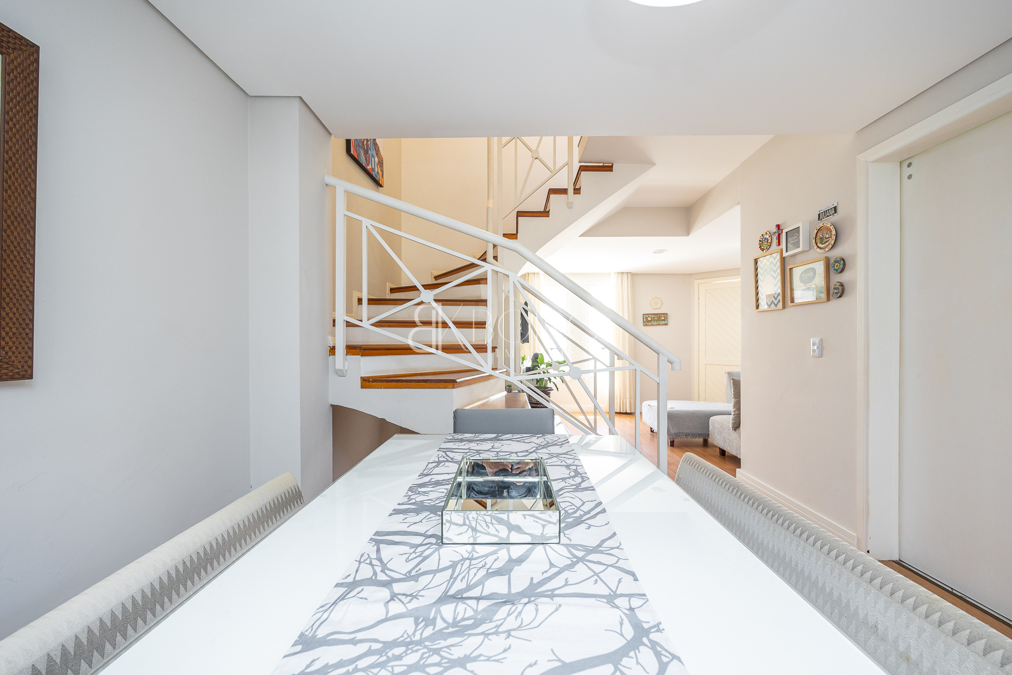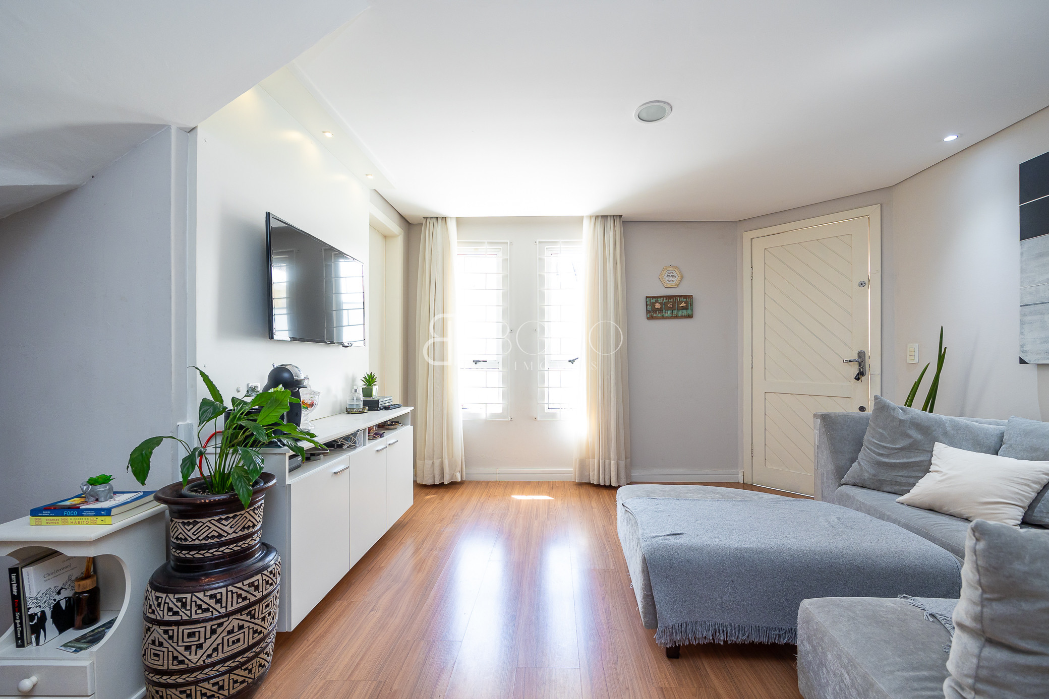 Térreo: Sala para dois ambientes, com ótima ventilação e luminosidade, teto rebaixado em gesso com iluminação, piso laminado, móveis planejados. Cozinha com armários sob medida, lavanderia com armários, espaço para jardim, escada em madeira.